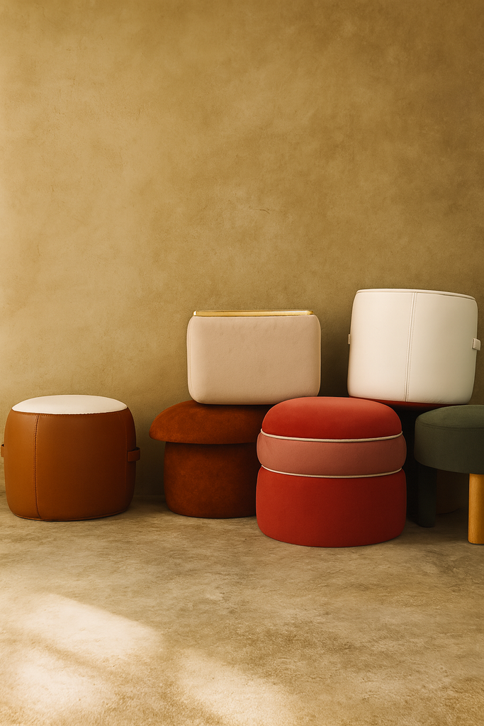 Inspired by the delicate silhouette of its namesake, the Macaroon Pouf Collection brings playful proportion and refined form to your space. Each pouf is upholstered in rich, tactile fabrics and designed as a sculptural accent — functional, inviting, and full of personality.